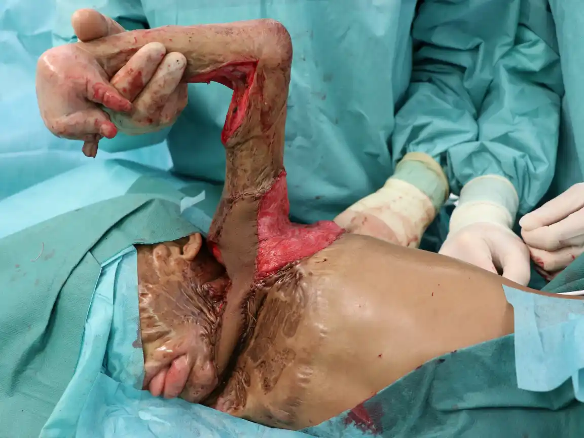 Nach tiefen Verbrennungen an Brust, Hals, Achselhöhlen, Gesicht, Arm und Hand hatte sich Lurdes’ Haut stark verändert. Narben zogen sich zusammen, Bewegung wurde eingeschränkt. Dort, wo ein Kinderkörper wachsen sollte, hielt ihn die Haut fest. Für Lurdes bedeutete das: eingeschränkte Beweglichkeit, Spannung, Schmerzen – und die Gefahr, dass sich Fehlstellungen weiter verstärken würden.