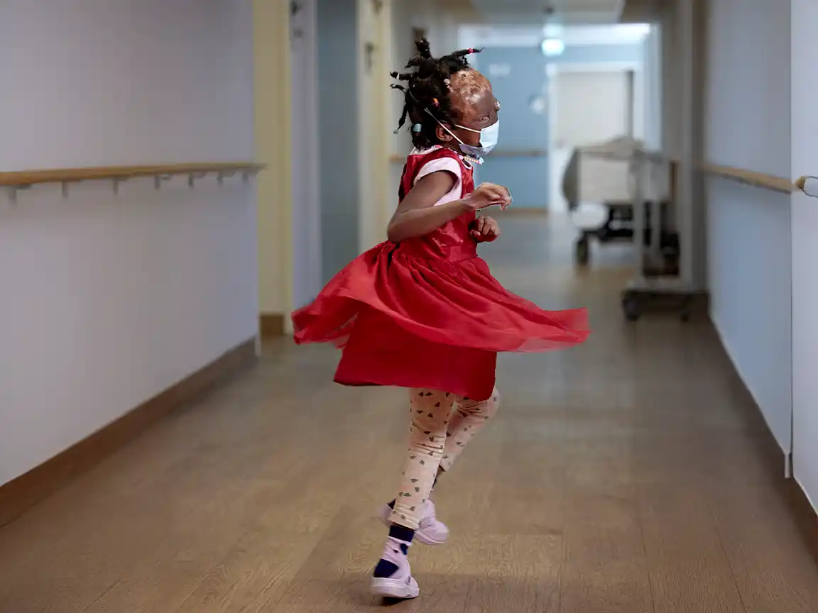 Im Krankenhaus sind viele Erwachsene um mich herum. Sie sprechen ruhig, tragen Masken und erklären viel. Manchmal habe ich Angst, besonders vor den Operationen. Aber manchmal bin ich auch sehr mutig, sagen sie. Ich liege auf dem Bett und versuche, still zu sein. Alle sagen, mein Gesicht braucht Zeit. Nach einer der Operationen wache ich auf und alles fühlt sich schwer an. Jemand sagt mir, ich soll mein Auge öffnen. Nicht das linke, sondern das andere. Ich sehe Licht, Farben und Gesichter. Es ist nicht alles wie früher, aber ich sehe wieder.